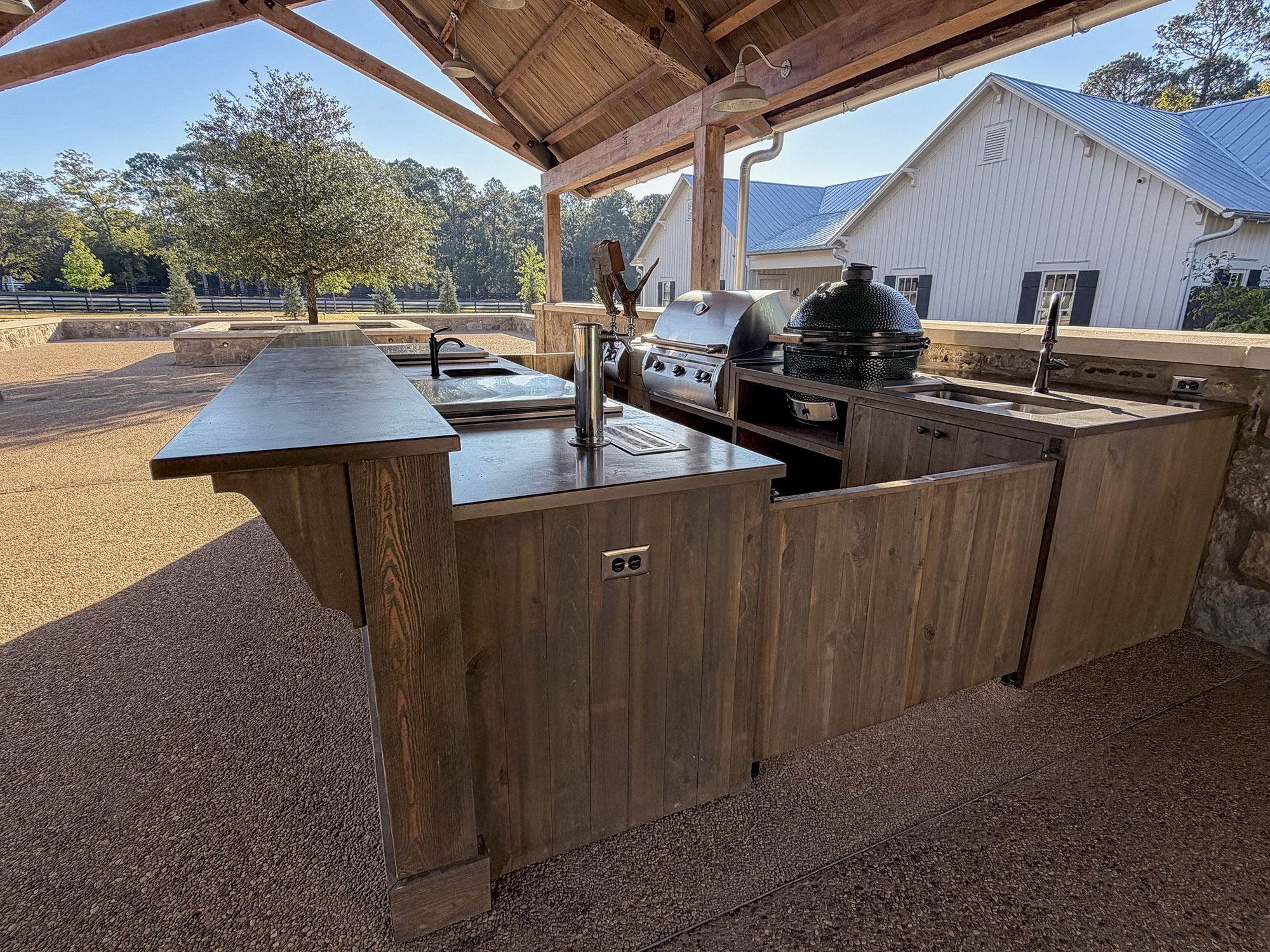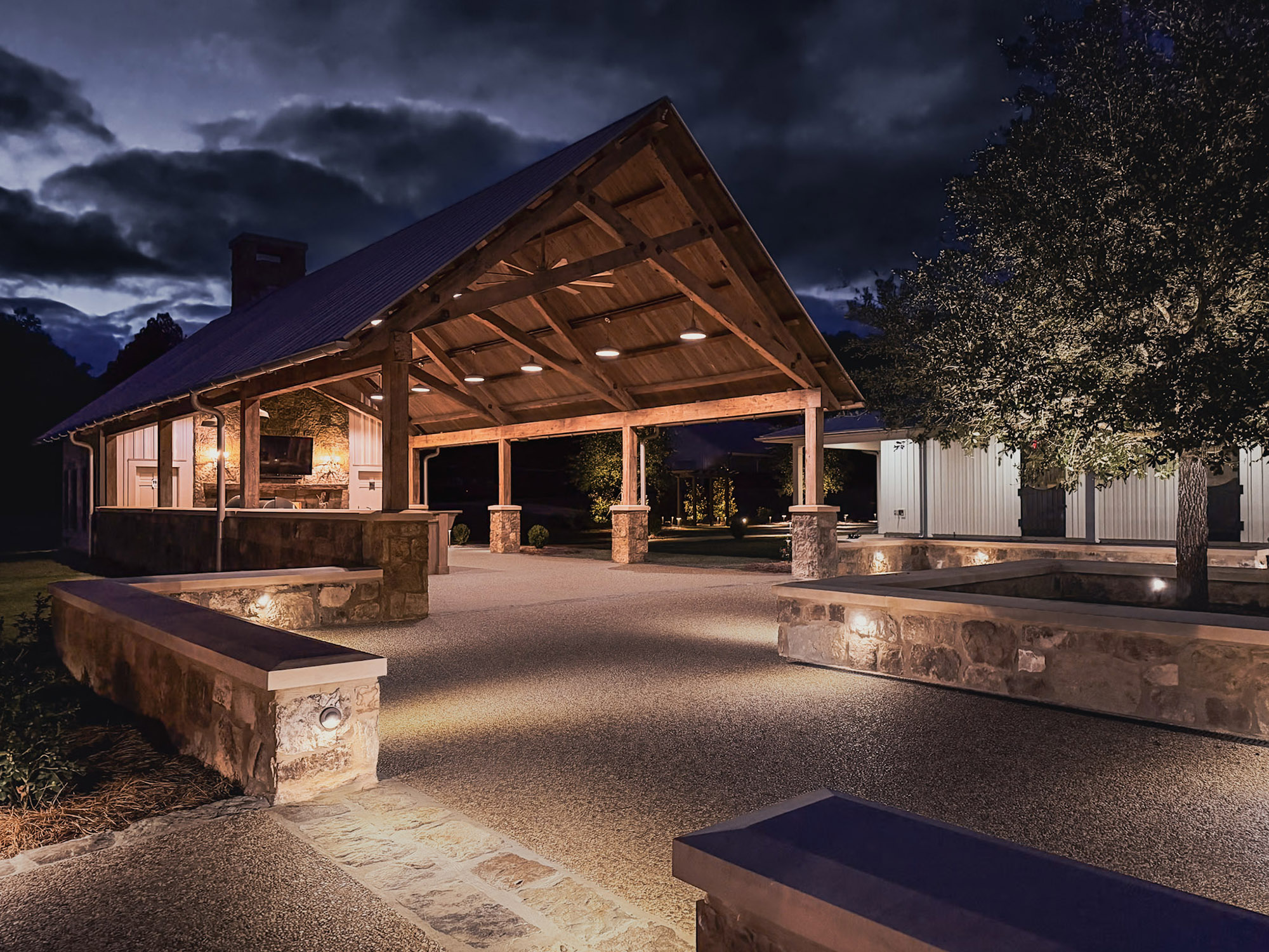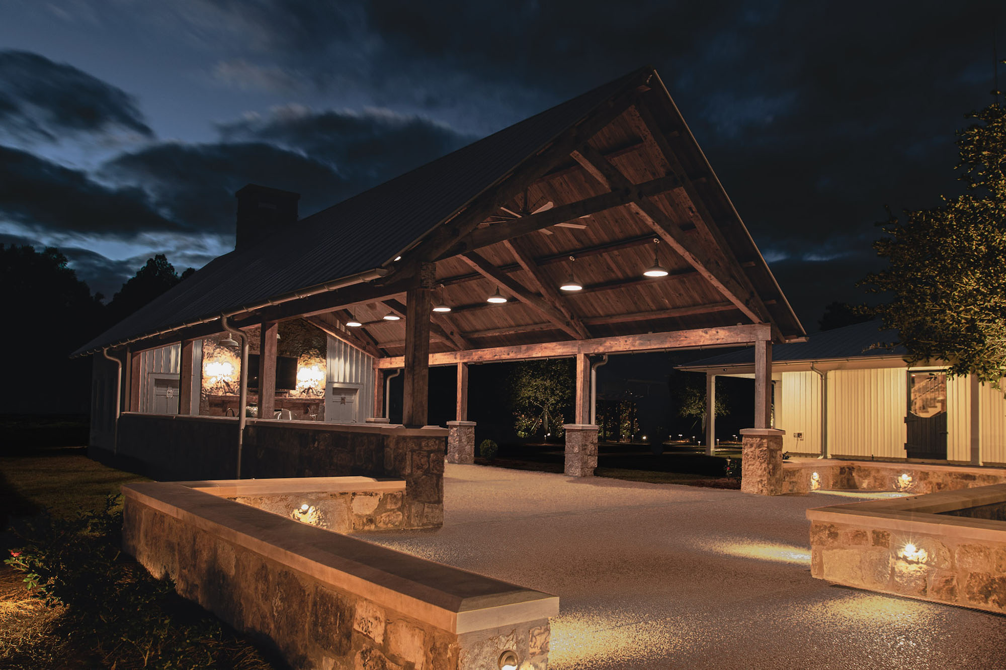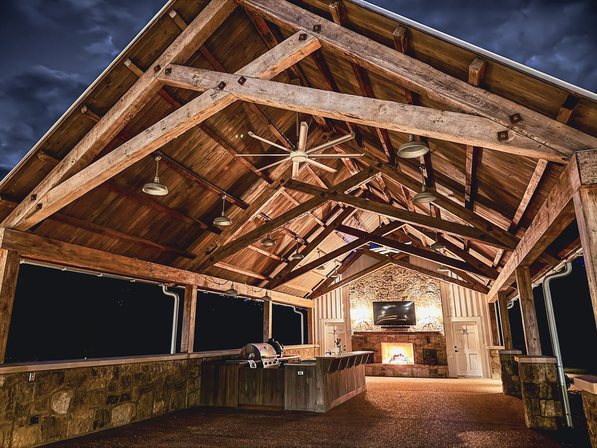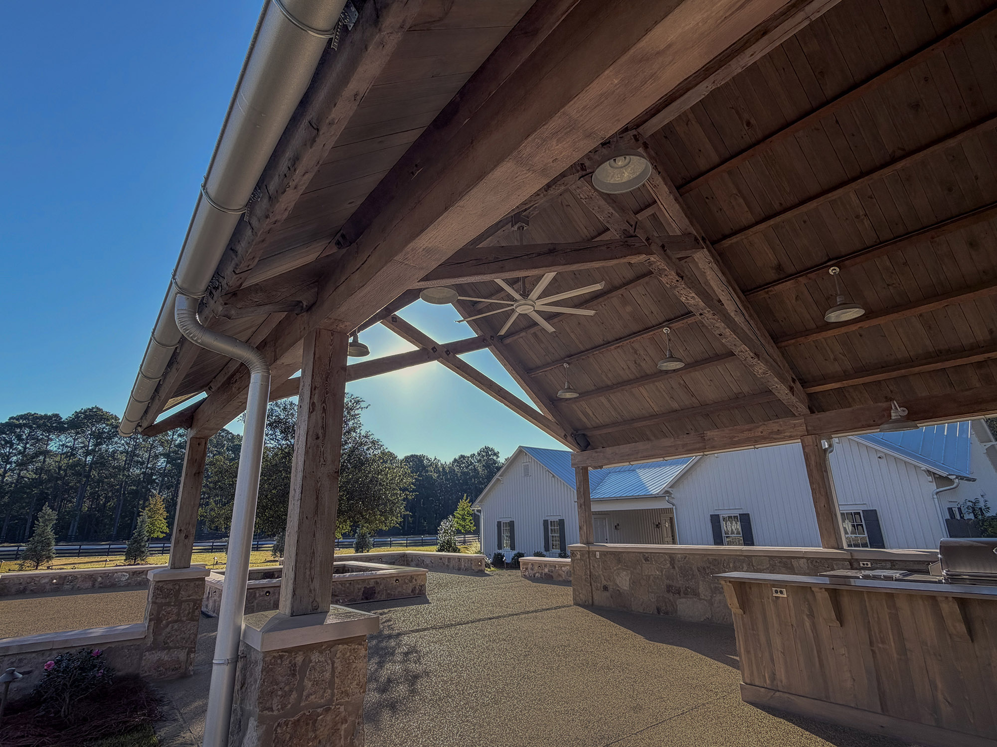 The Pavilion features structural scissor trusses made from reclaimed heart pine timbers, crafted on-site, along with reclaimed boxed posts and beams that conceal the steel support structure. A full masonry fireplace with propane ignition serves as a central gathering point.