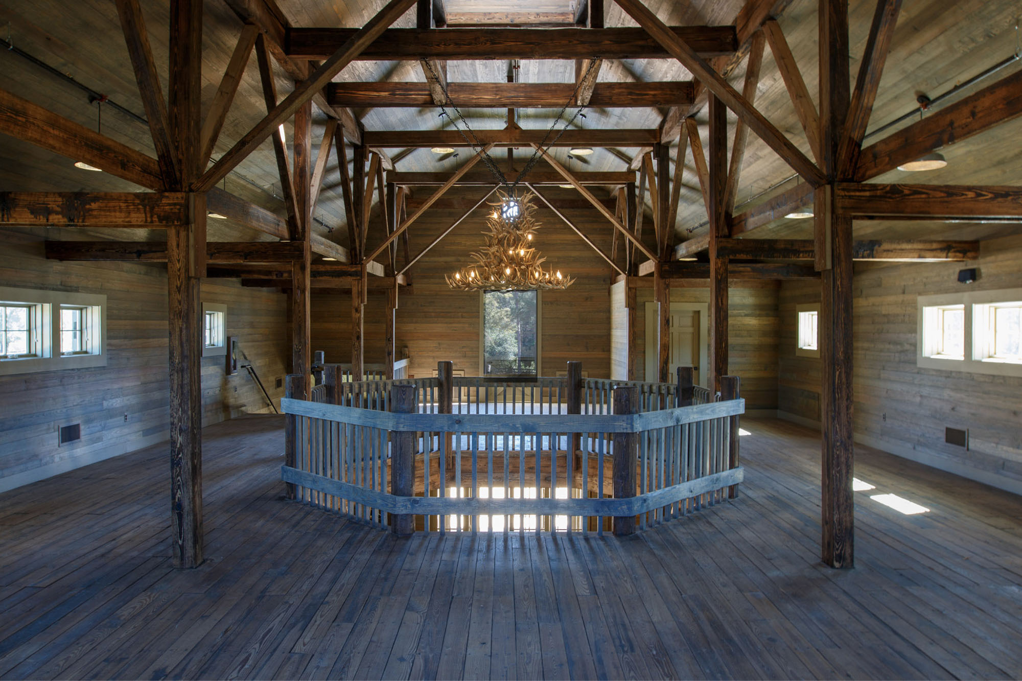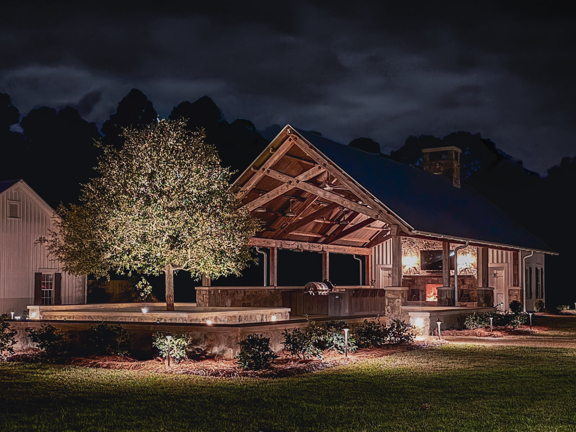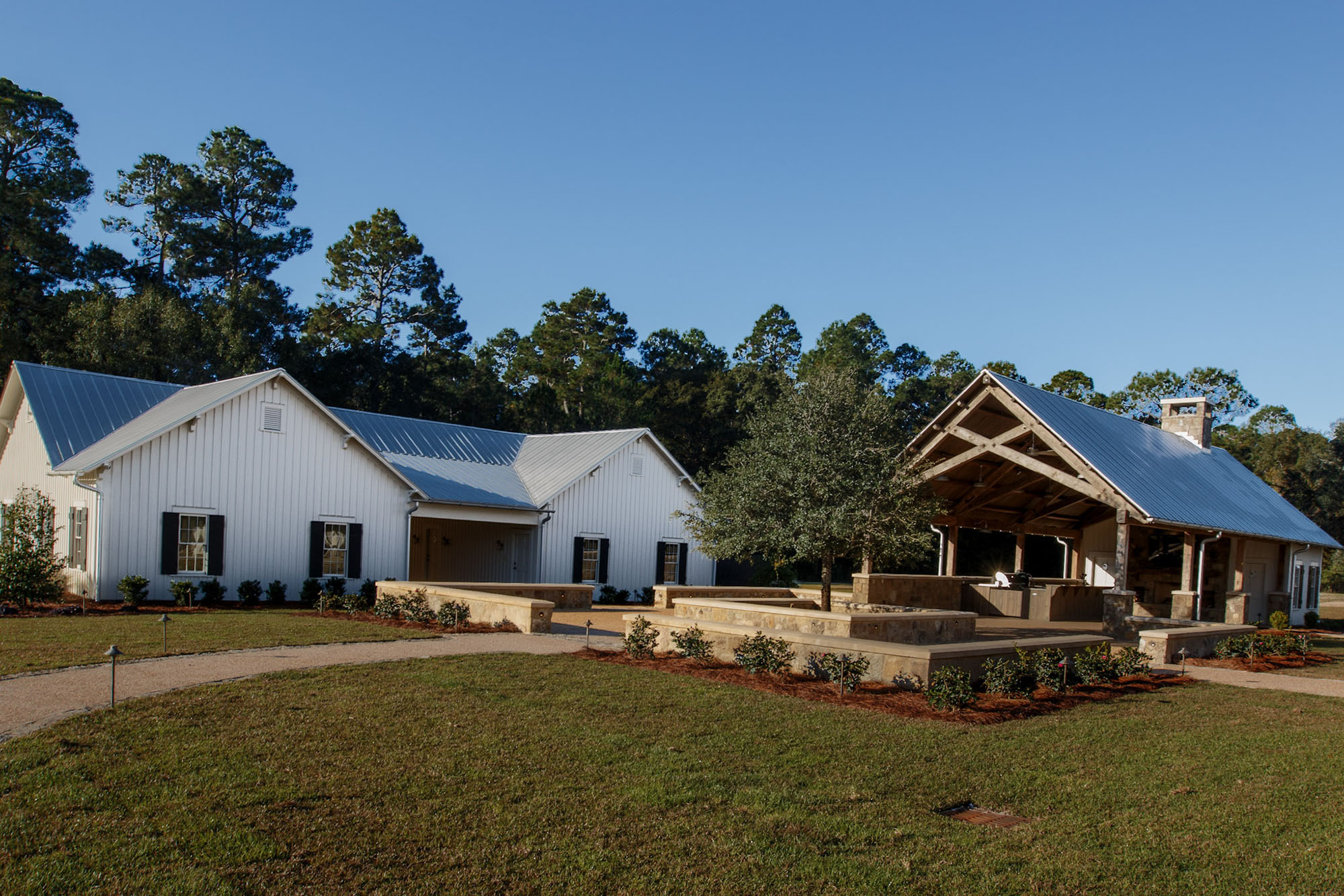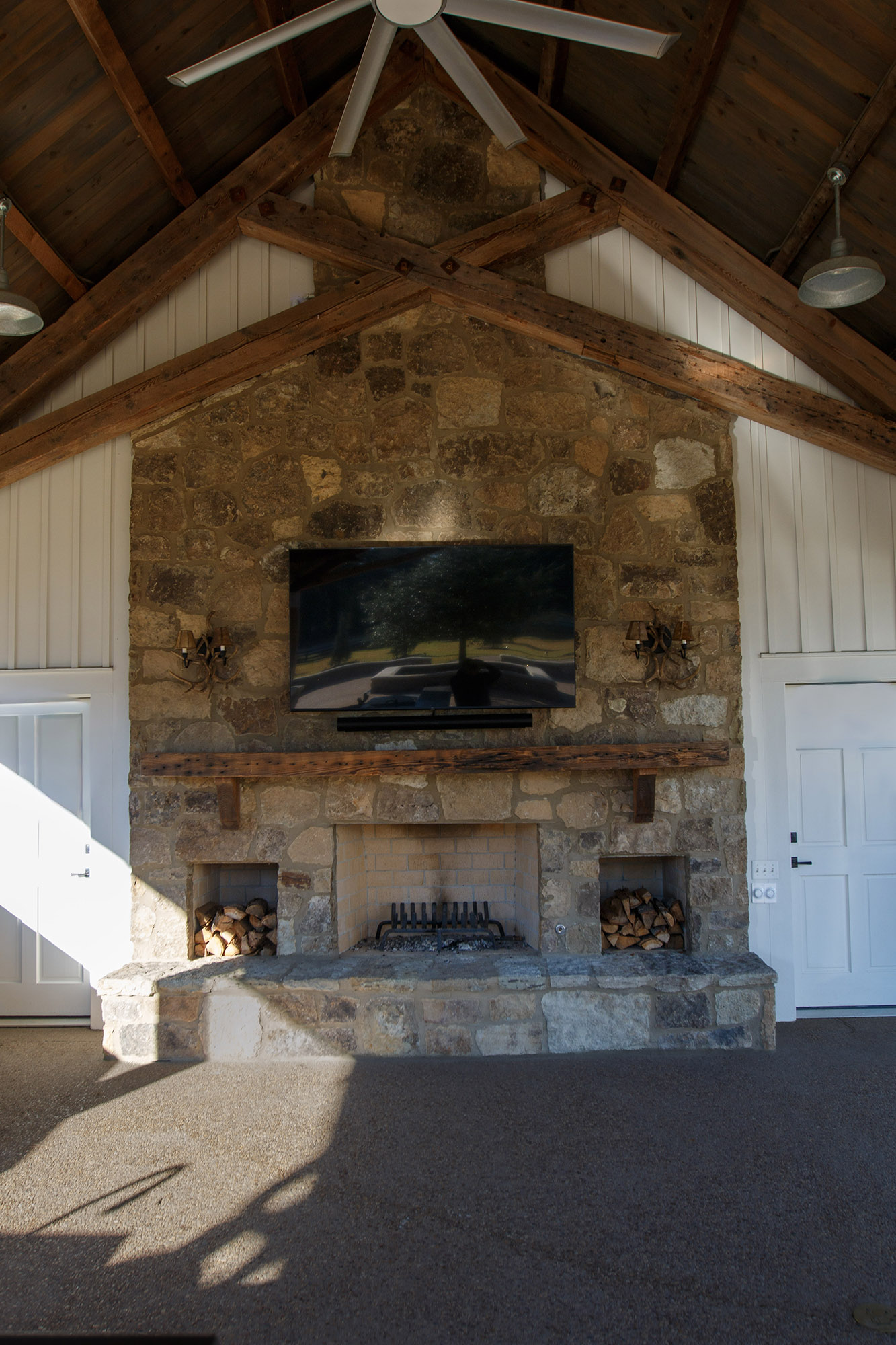 The Pavilion features structural scissor trusses made from reclaimed heart pine timbers, crafted on-site, along with reclaimed boxed posts and beams that conceal the steel support structure. A full masonry fireplace with propane ignition serves as a central gathering point.