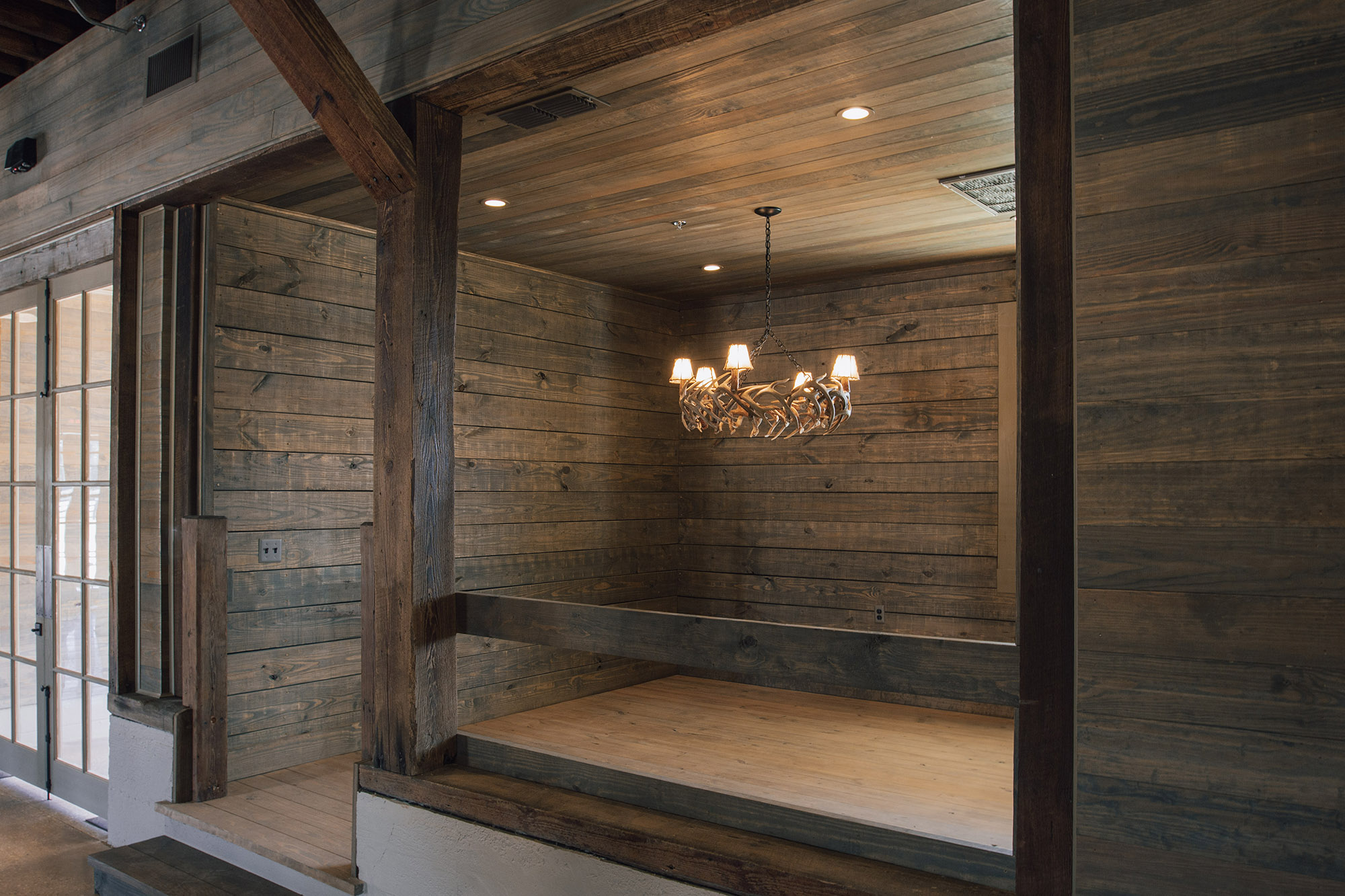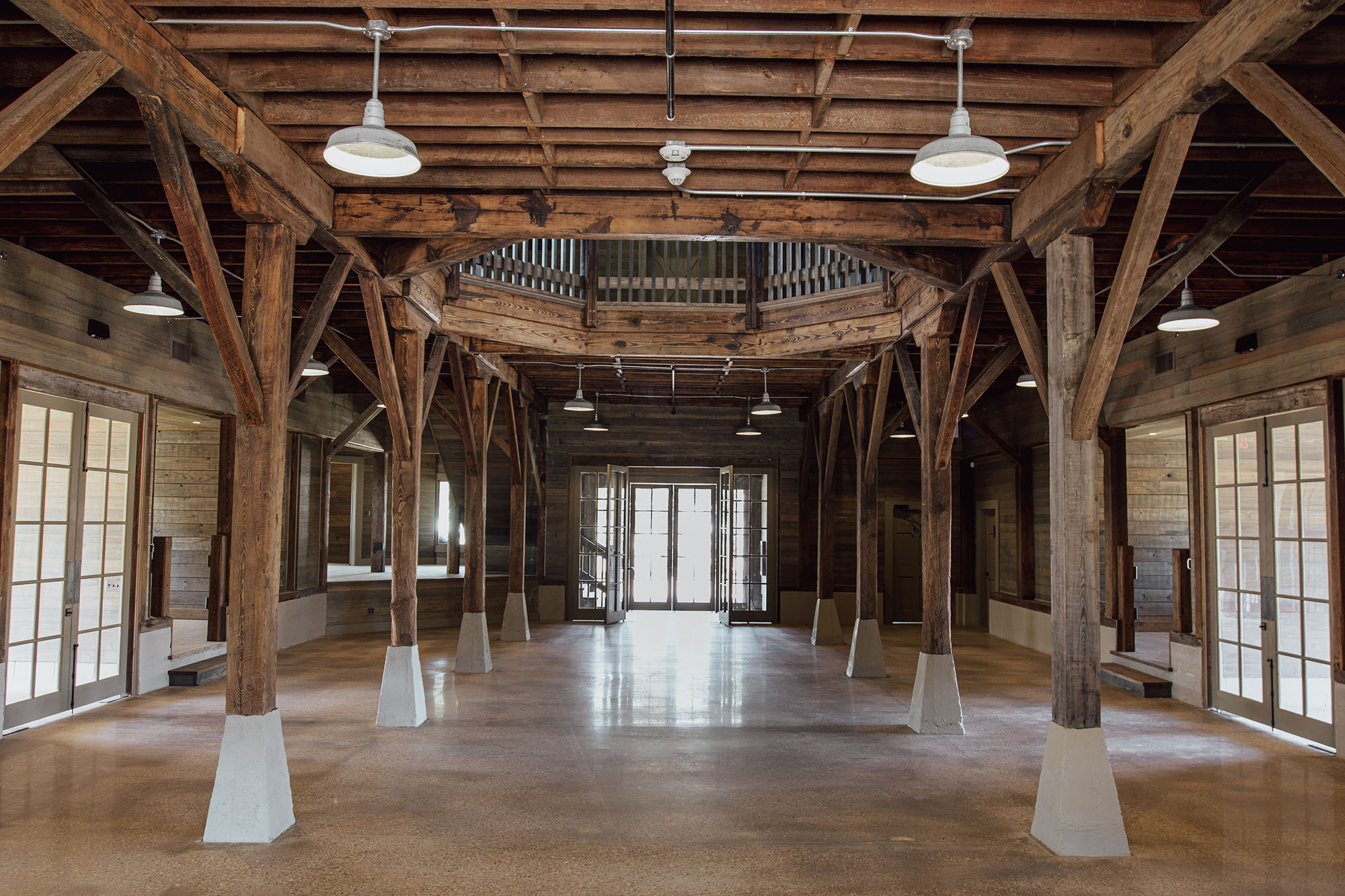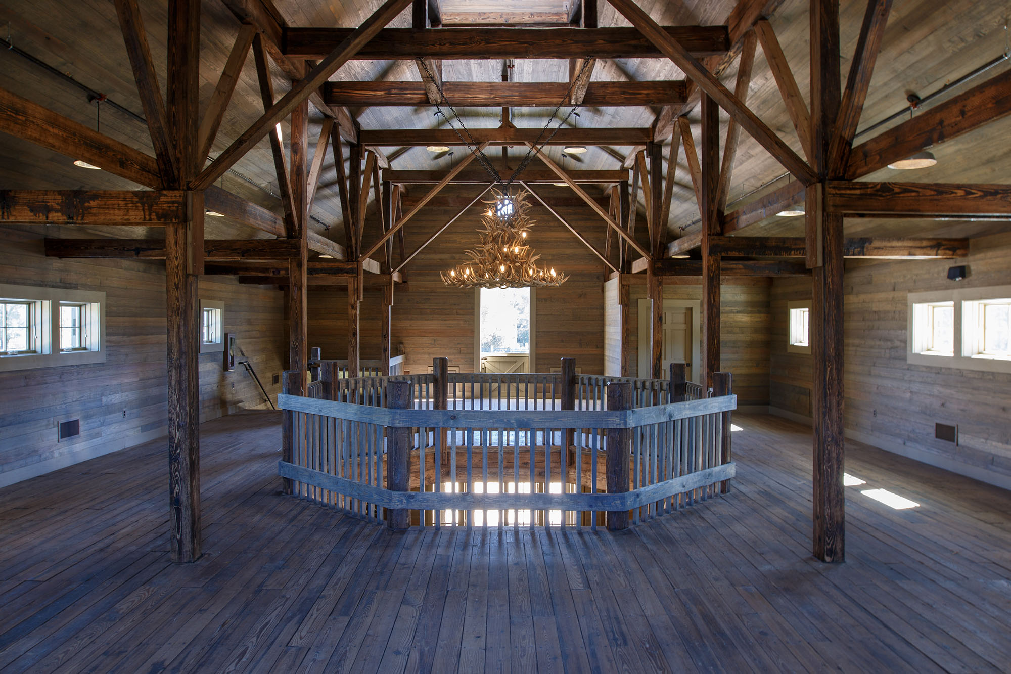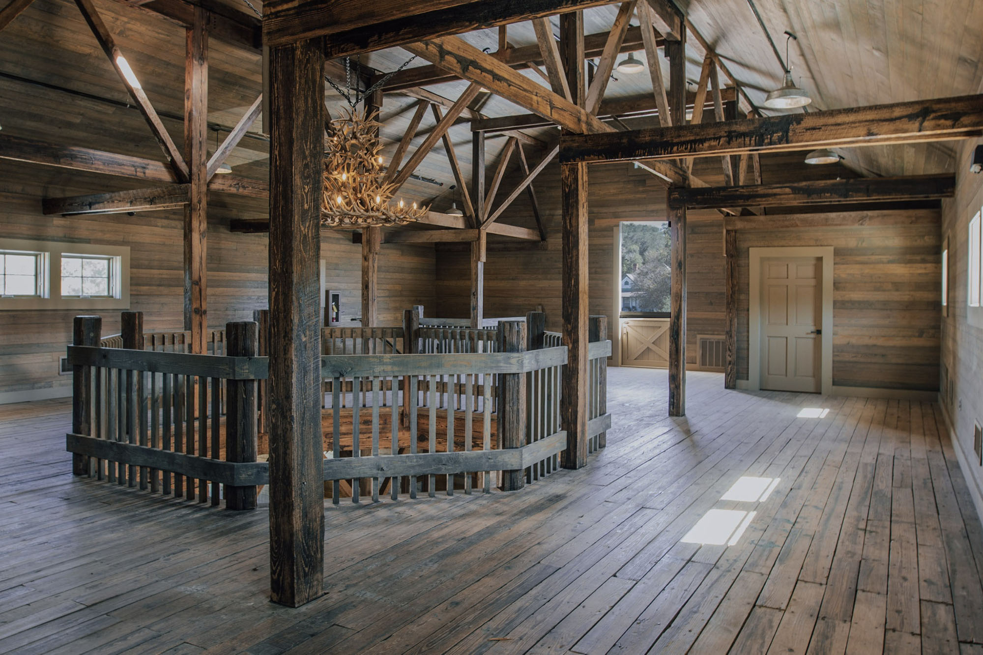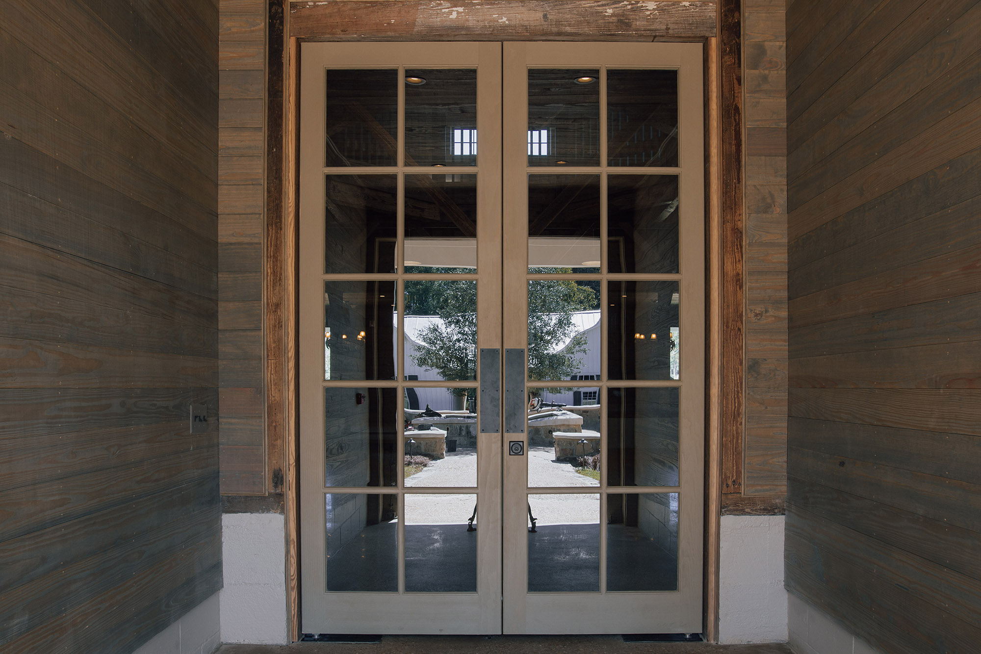 The Pavilion features structural scissor trusses made from reclaimed heart pine timbers, crafted on-site, along with reclaimed boxed posts and beams that conceal the steel support structure. A full masonry fireplace with propane ignition serves as a central gathering point.