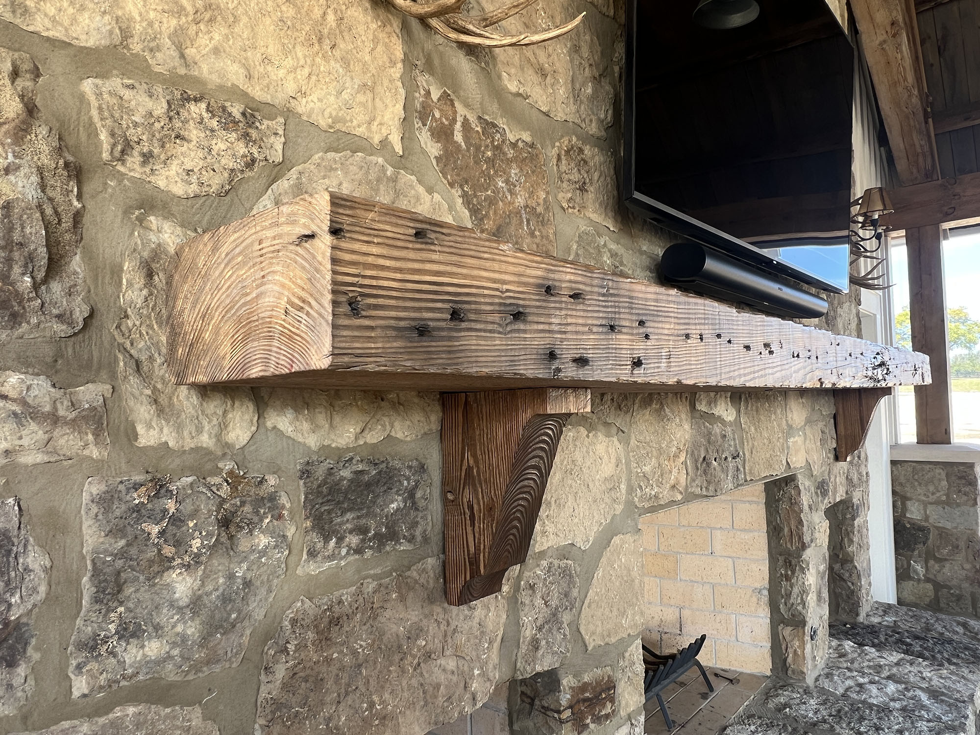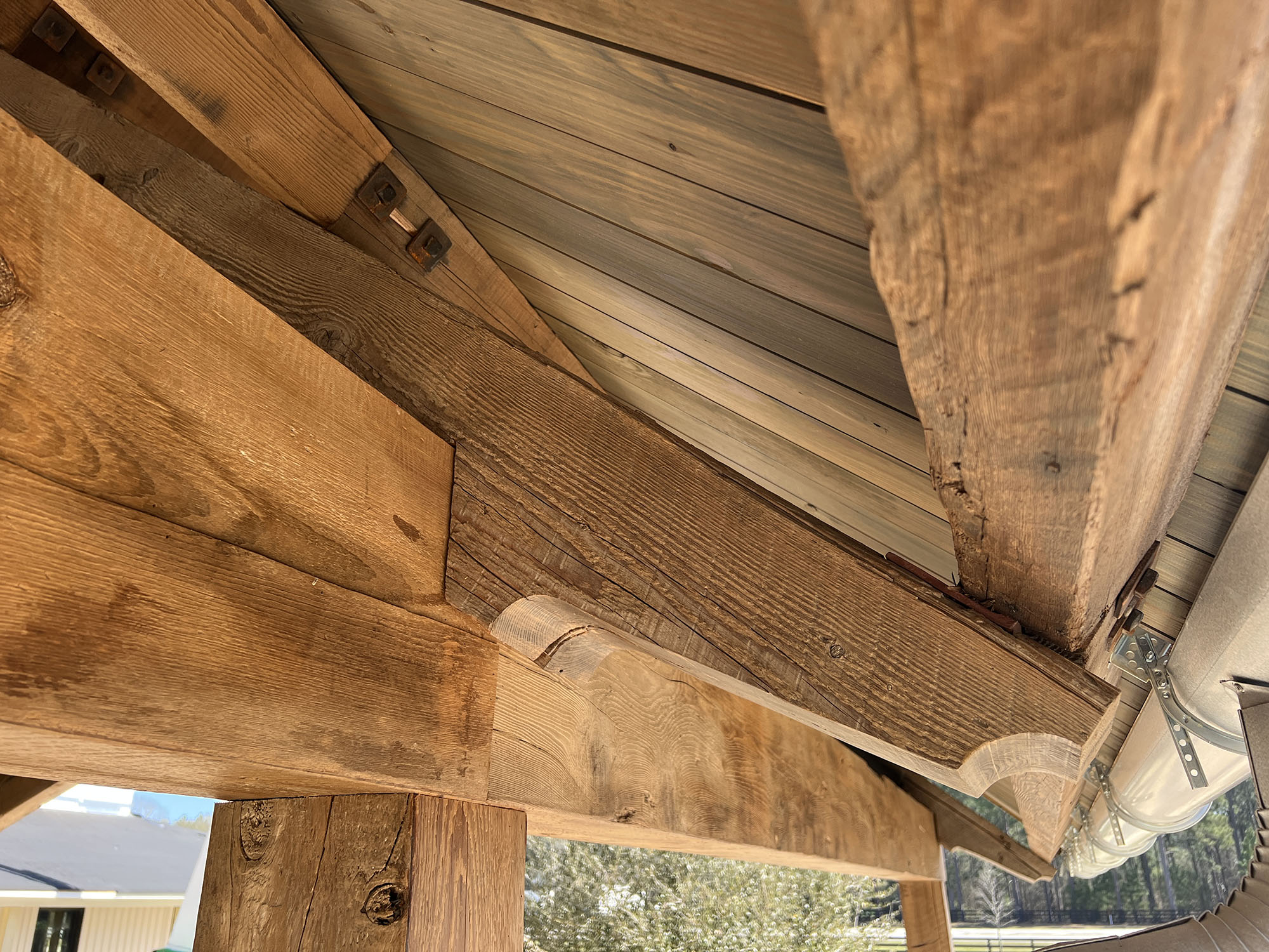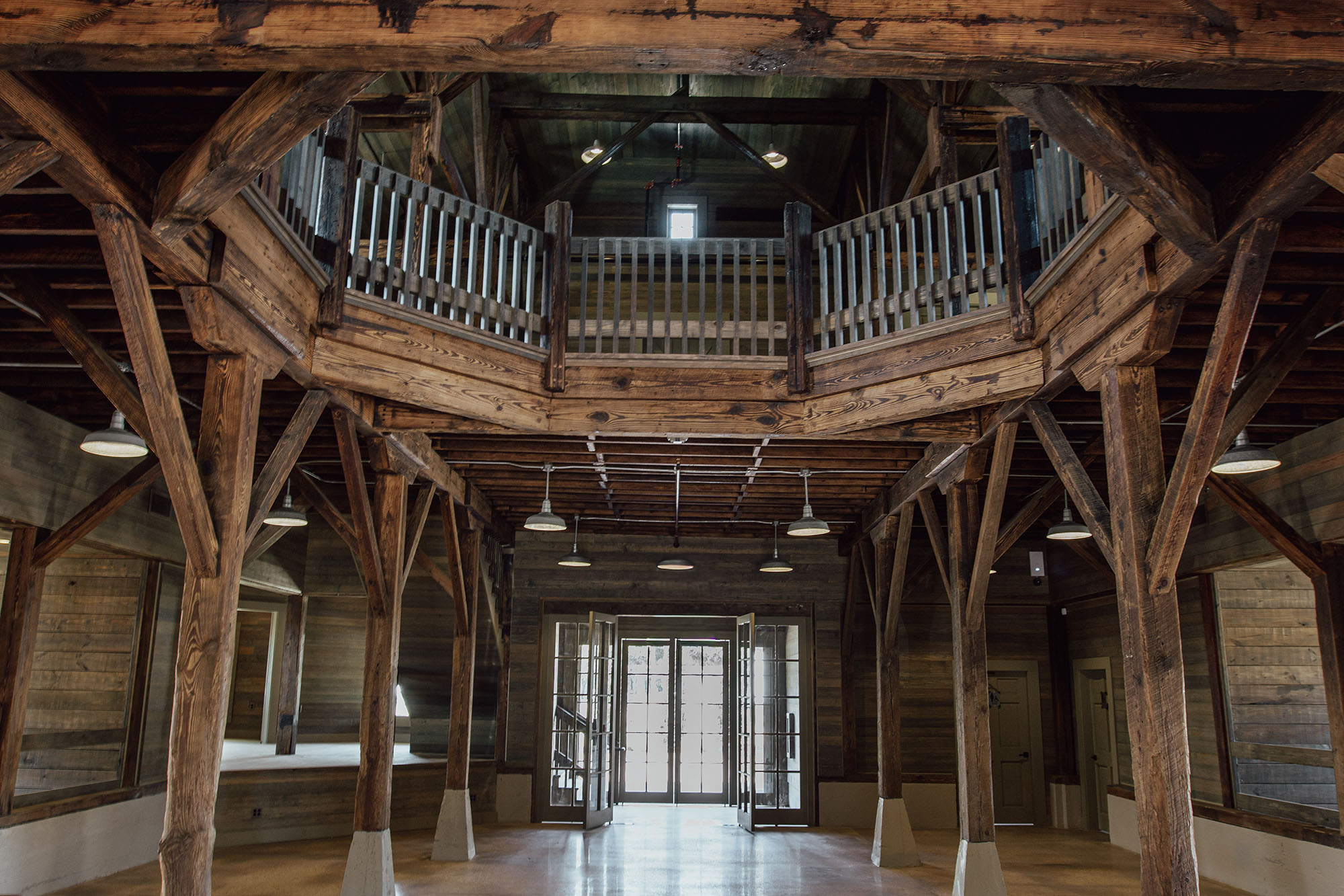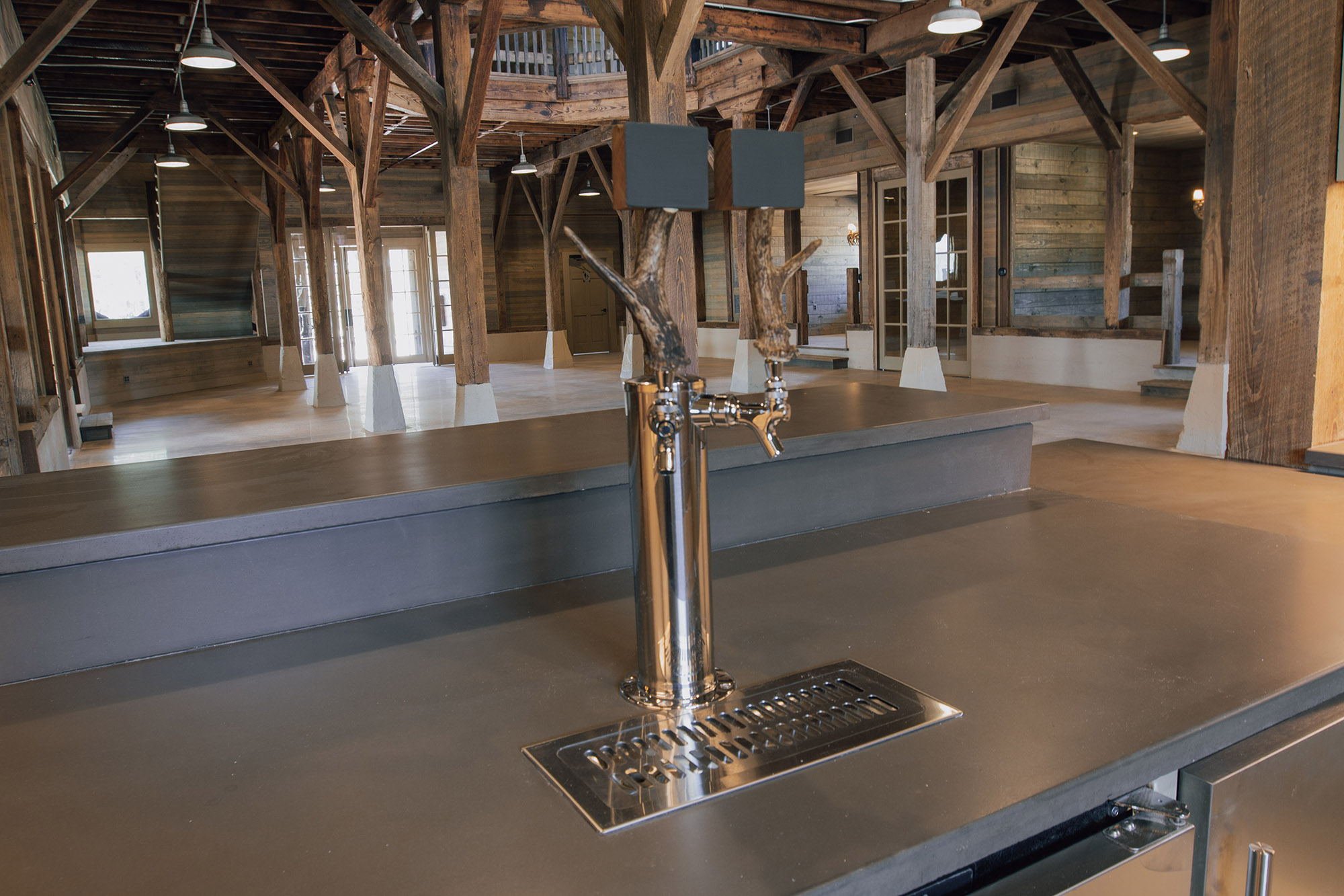 The Pavilion features structural scissor trusses made from reclaimed heart pine timbers, crafted on-site, along with reclaimed boxed posts and beams that conceal the steel support structure. A full masonry fireplace with propane ignition serves as a central gathering point.