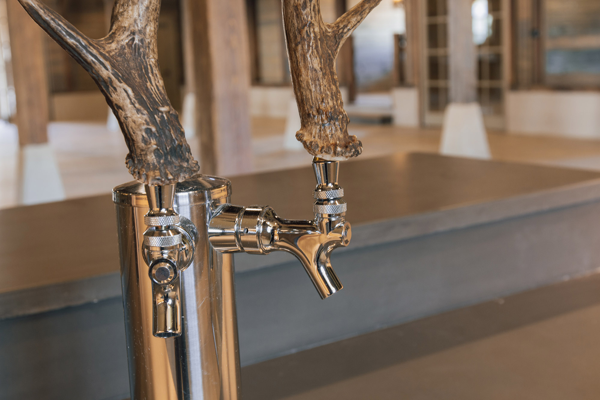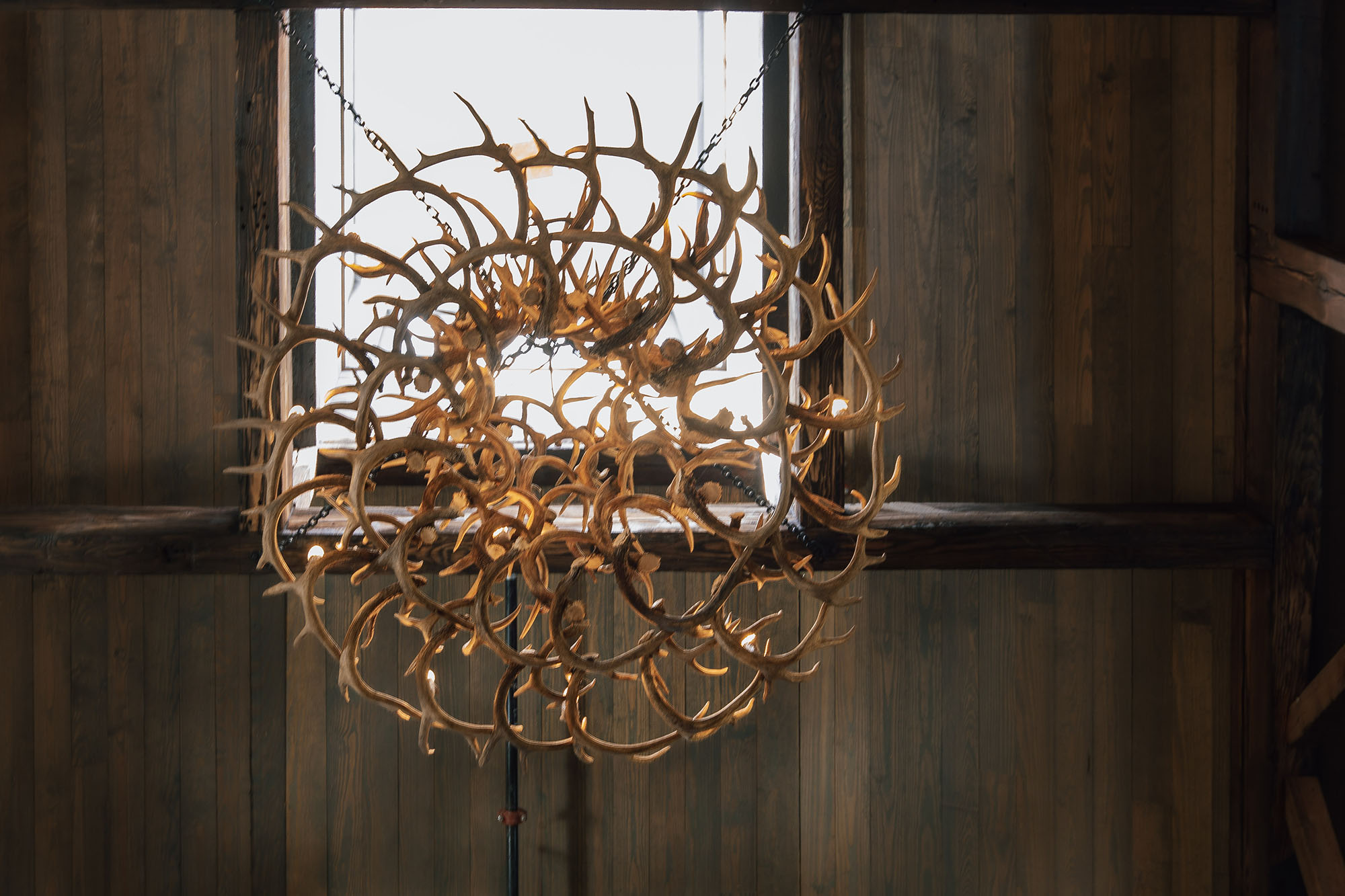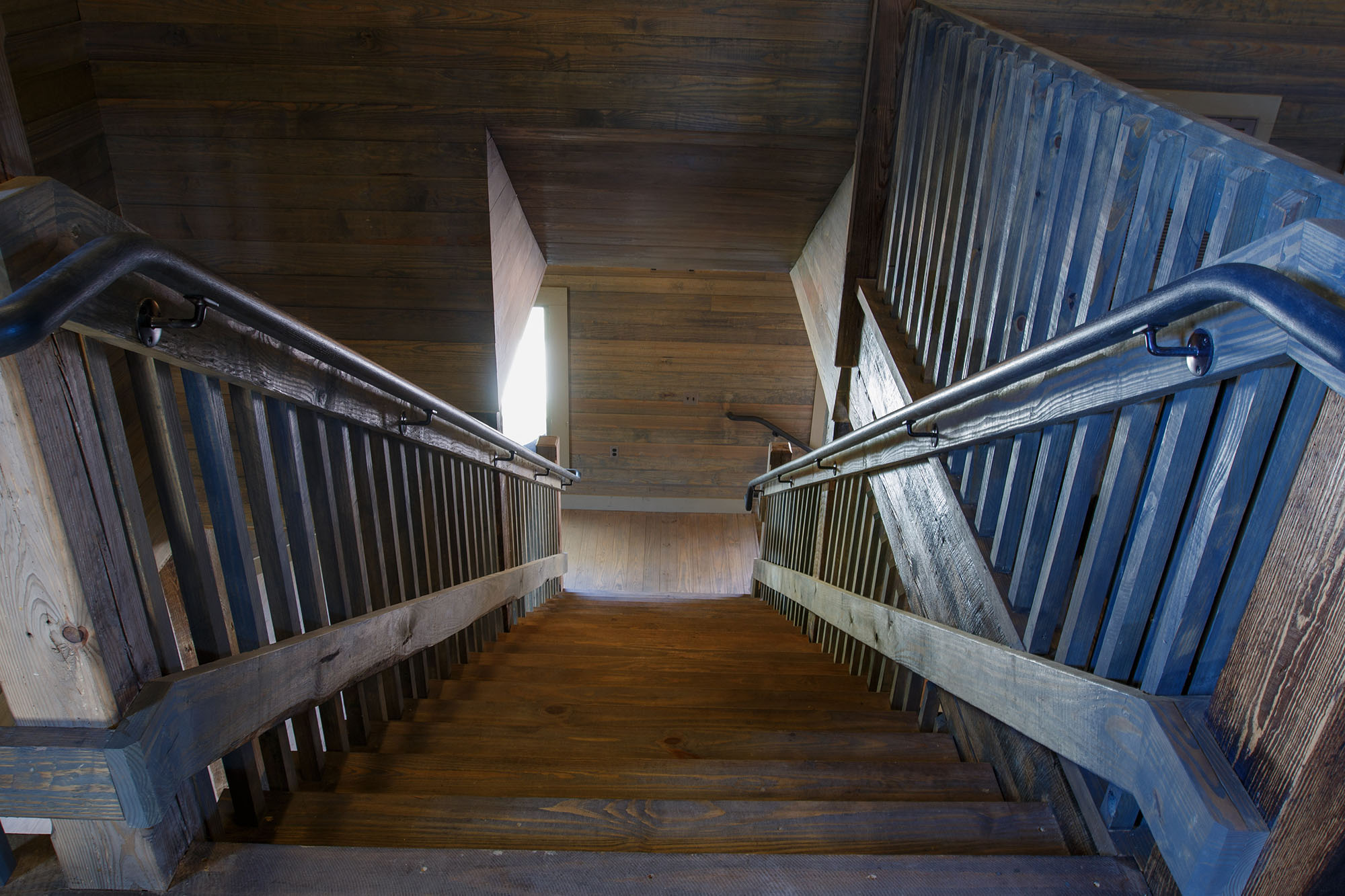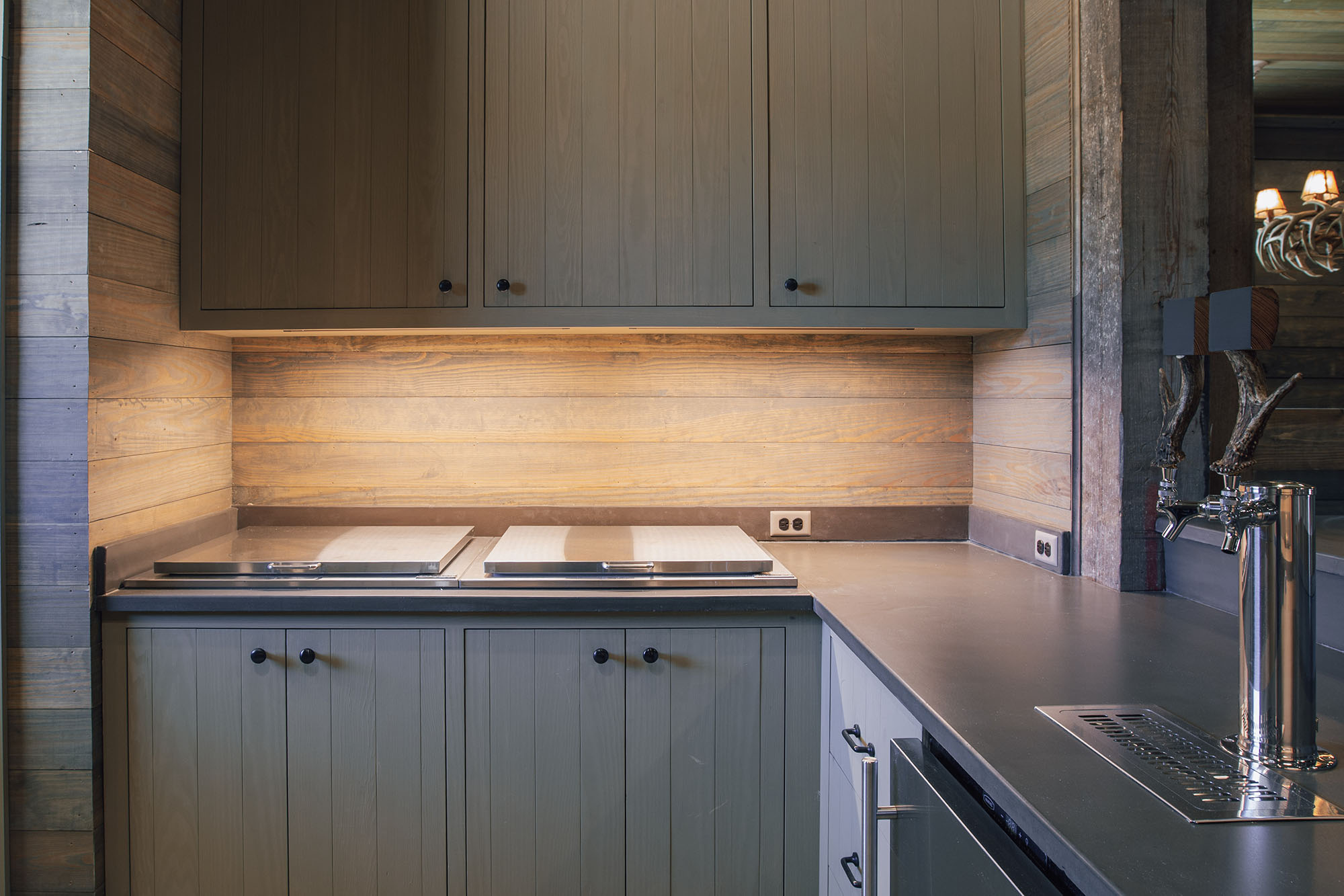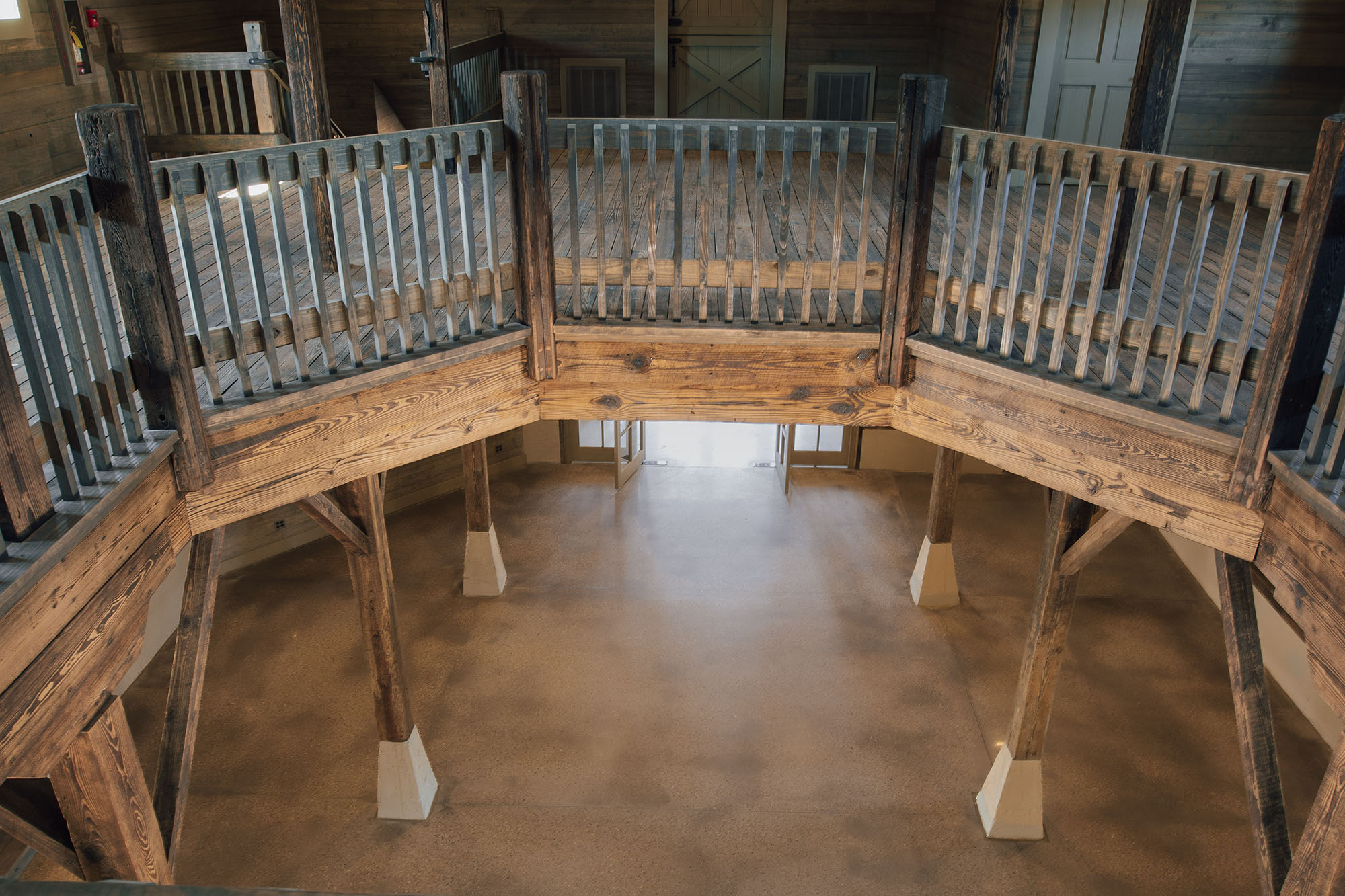 The Pavilion features structural scissor trusses made from reclaimed heart pine timbers, crafted on-site, along with reclaimed boxed posts and beams that conceal the steel support structure. A full masonry fireplace with propane ignition serves as a central gathering point.